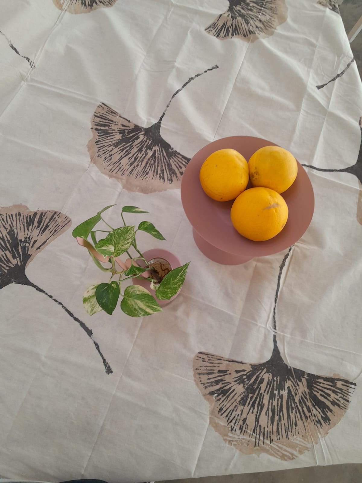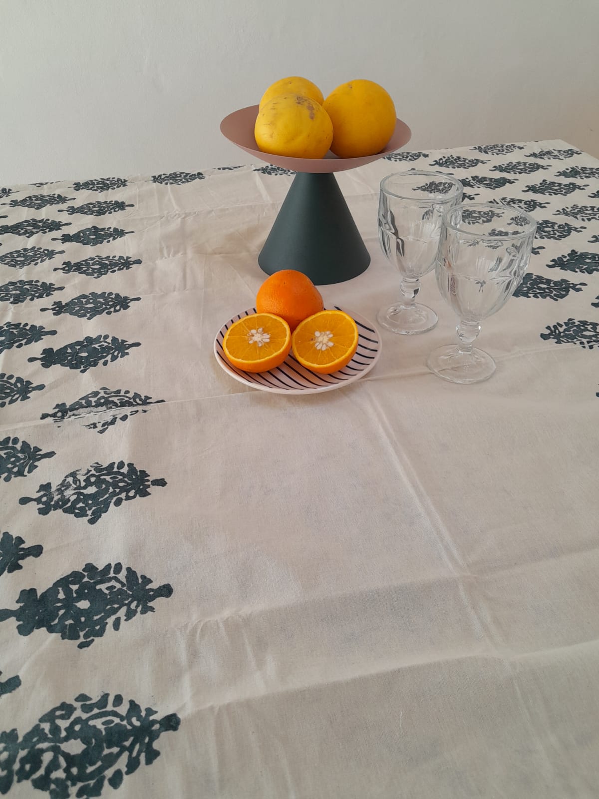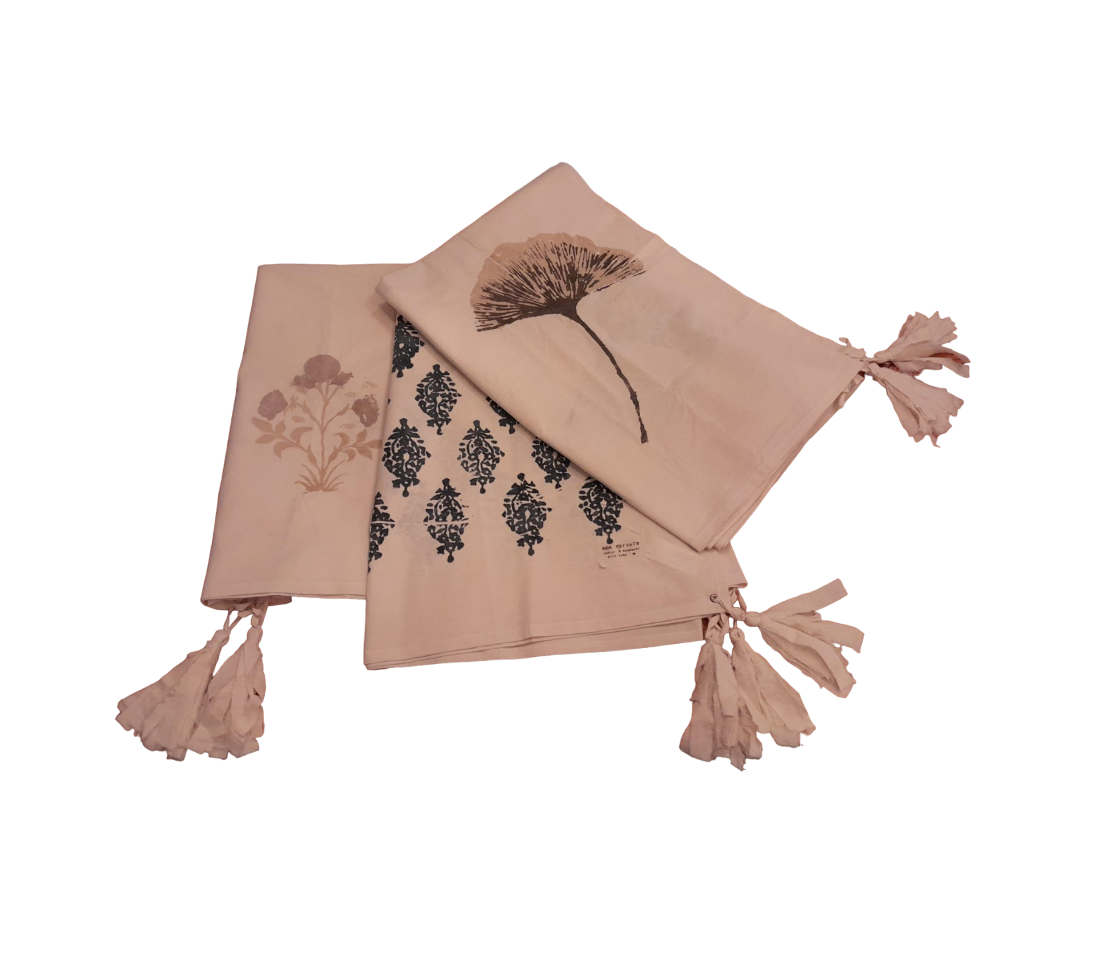Mantel de lienzo de algodón estampado, con arandelas y borlas en las puntas. Achica aproximadamente 5 % en el primer lavado. Las estampas y colores son hechas a mano. Un producto artesanal con estampas únicas.